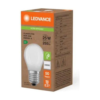 Grazie al suo consumo di soli 1.2W e la sua lunga durata di 50000 ore, puoi risparmiare fino al 60% di energia e con costi di manutenzione abbattuti. Le tradizionali lampadine a incandescenza durano solamente 1000 ore. Installare la lampadina LED è veramente facile, basta svitare la vecchia lampadina E27 ( una volta fredda ) e avvitare successivamente la nuova lampada di Ledvance con forma Pera nel portalampade. Questo prodotto di Ledvance è di qualità professionale.