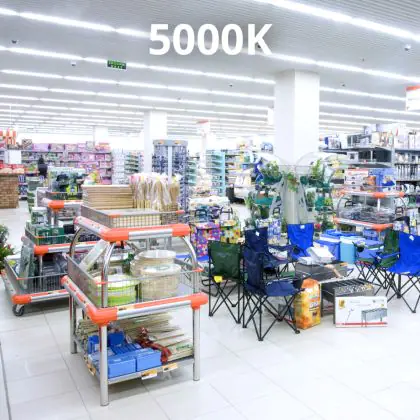 Questo sistema luminoso è adatto per l’illuminazione di capannoni industriali, magazzini e supermercati con soffitti alti. La temperatura di colore di colore bianco molto freddo (5000K) è ideale per un’illuminazione intensa e brillante.