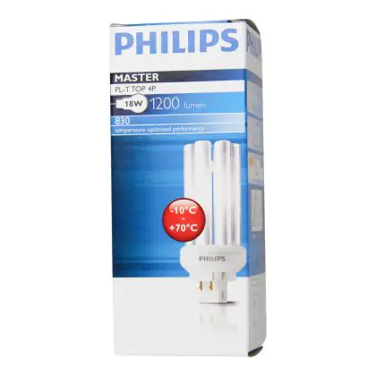 Le Philips PL-T TOP 18W 830 4P (MASTER) sono efficienti lampade fluorescenti compatte a basso contenuto di mercurio. Sono molto efficienti e garantiscono performance ottimali di illuminazione per periodi di accensione lunghi. Tali lampade fluorescenti compatte sono dotate di attacco GX24q-2 e la base presenta 4 pin (perni). La potenza delle stesse é pari a 18W. Quando sostituisci le tue lampade fluorescenti compatte é fondamentale scegliere le nuove con il medesimo attacco, numero di pin (perni) e potenza di quelle che stai attualmente usando altrimenti non sarai in grado di installarle. La temperatura di colore di queste lampade fluorescenti a basso consumo (che é di 3000K) corrisponde ad una luce bianca calda. L'indice di resa cromatica si pone nell'intervallo di 80-89Ra. Queste lampade sono in classe efficienza energetica 'B' . La vita media é lunga, 13.000 ore in media.